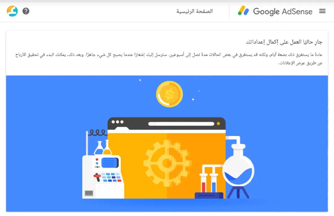 الان قد انتهينا من ادخال البيانات سوف يطلب منك الانتظار لاكمال البيانات وسوف تظهر لك هذه الواجهه وعليك الانتظار تقريب من يومين الي اسبوع وفي بعض الاحيان يتطلب الامر اكثر من شهر كل ما عليك في هذه الفتره الاهتمام بالمدونه الخاصه بك وانشاء المواضيع وانصحك ان تكون حصريه وعناوينها جذابه بقدر الامكان لتجذب الزائرين لمدونتك وتبدأ في جني الارباح فور انتهاء جوجل ادسنس من مراجعه الحساب الخاص بك .